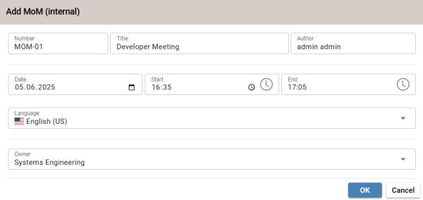 Enter the information about the meeting in the dialog box and click OK to create the meeting minutes.